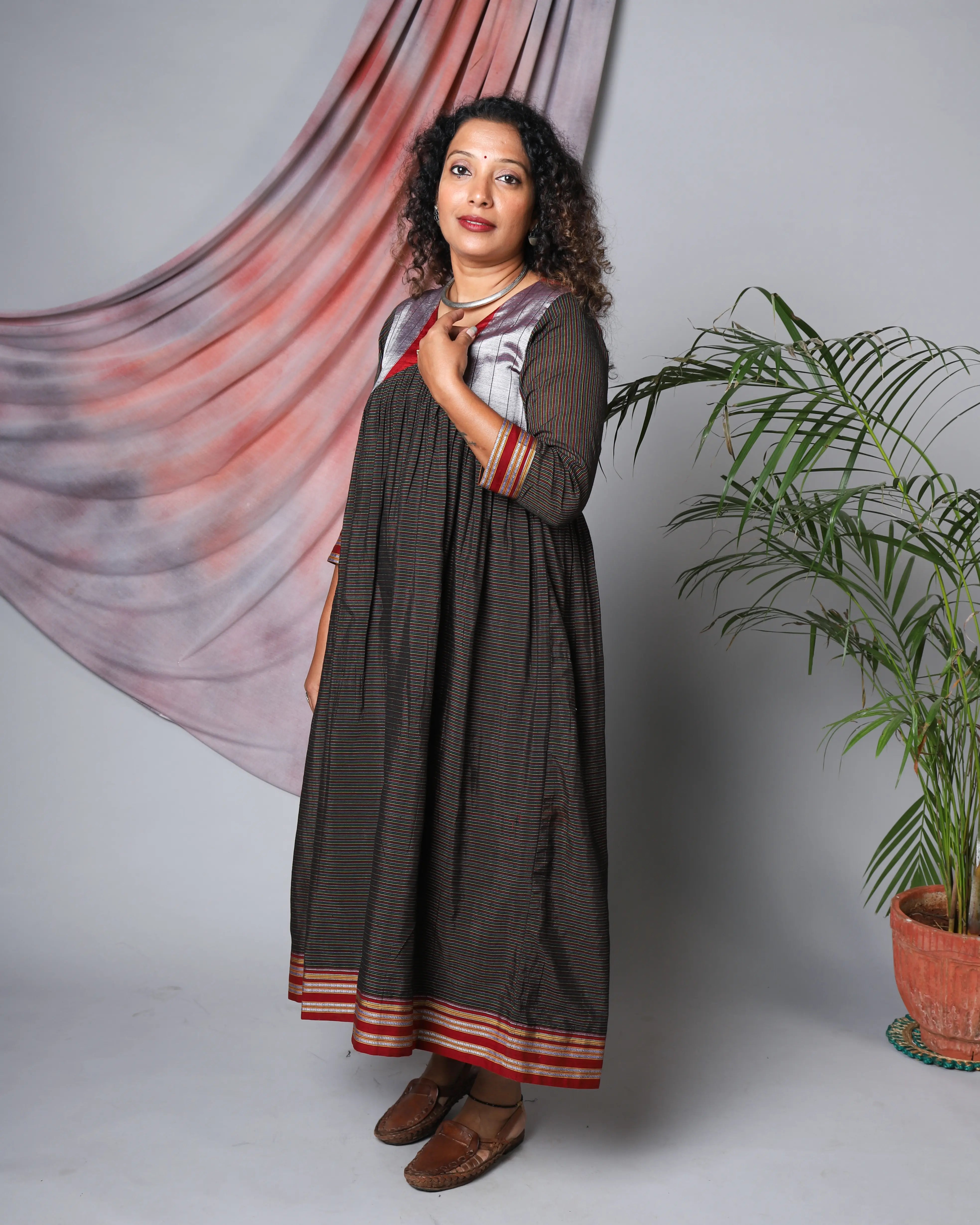 A graceful fusion of tradition and modern elegance, the Katun Nimi Ilkal Dress is a timeless statement piece. The Alia cut silhouette offers a sleek and flattering fit, while the authentic Ilkal fabric, handwoven by skilled artisans, lends a rich texture and cultural depth. The intricate pallu border detailing at the hem adds a striking contrast, making it a perfect choice for festive gatherings and cultural occasions.